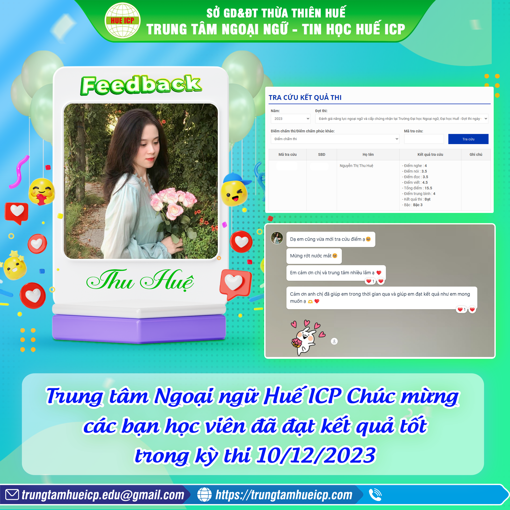 🌟 Trong kỳ thi ĐGNL Ngoại ngữ 3 bậc B1 B2 C1 diễn ra vào ngày 𝟏𝟎/𝟏𝟐/𝟐𝟎𝟐𝟑 tại Đại học Ngoại ngữ, Đại học Huế các bạn học viên tham gia luyện thi tại Huế ICP đã có một kết quả tốt. Điều này thực sự là minh chứng cho chất lượng đào tạo tuyệt vời mà chúng tôi mang lại.