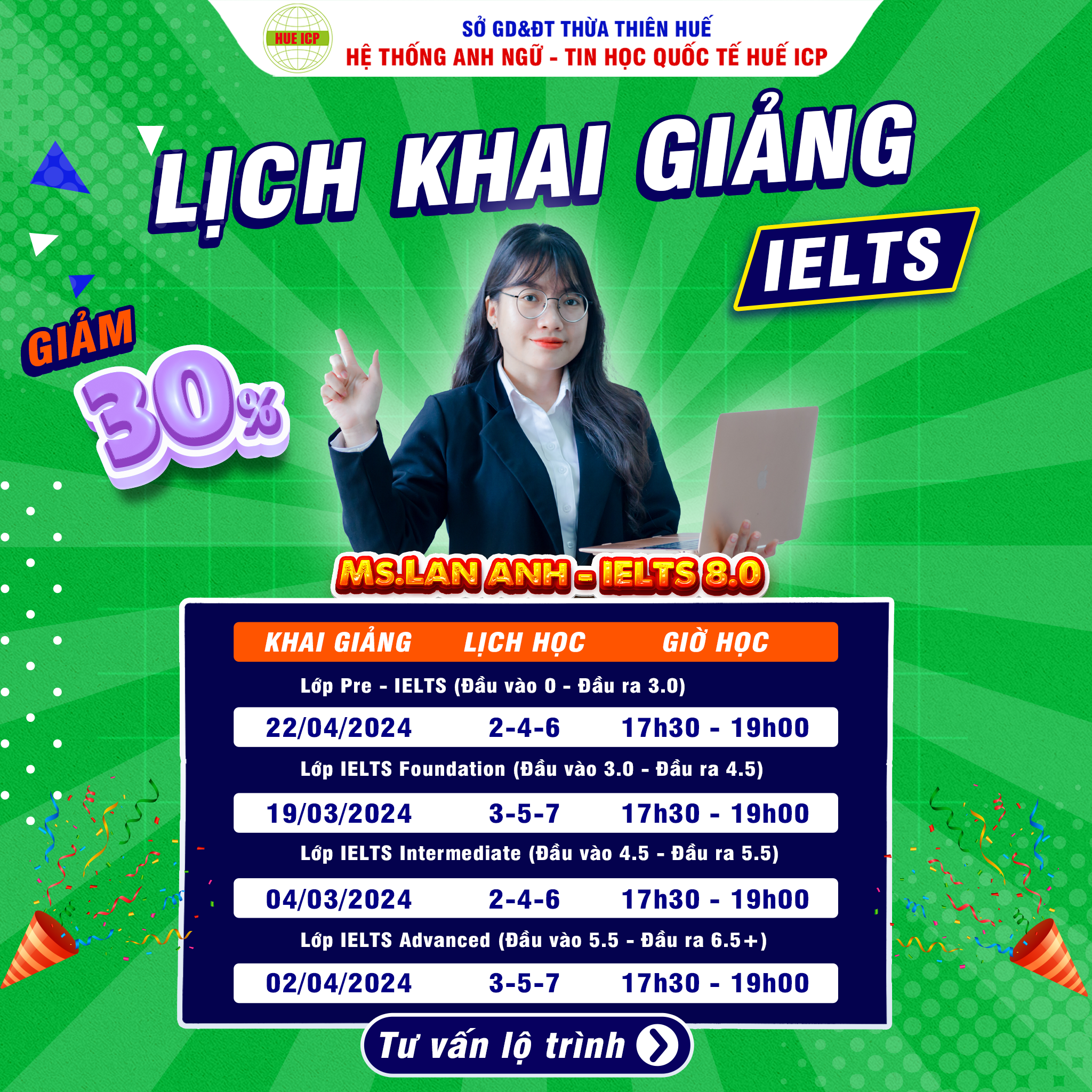 Khai giảng liên tục 04 khoá học đầu năm 2024 – Nhận ngay lì xì cực khủng với chương trình ƯU ĐÃI 𝐠𝐢𝐚̉𝐦 𝟑𝟎% toàn bộ các khoá IELTS tại Huế ICP ![]()