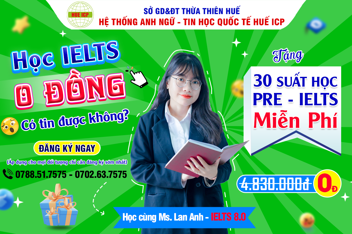 Tháng 3 này, Huế ICP khai giảng lớp Pre – 𝐈𝐄𝐋𝐓𝐒 hoàn toàn MIỄN PHÍ để giúp các bạn có cơ hội được trải nghiệm môi trường học tập hiện đại, chất lượng và chuẩn quốc tế.