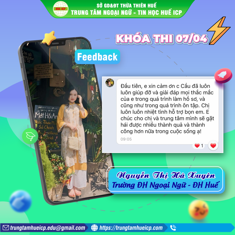 Trăm lời QUẢNG CÁO không bằng một FEEDBACK của học viên đã hoàn thành các khóa học tại trung tâm Huế ICP. Chúc mừng các bạn học viên đã đạt kết quả cao trong kỳ thi khóa 12/05/2024 vừa qua.…