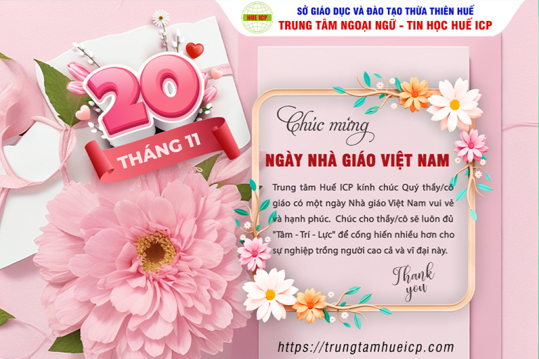 Trung tâm Huế ICP kính chúc Quý thầy/cô giáo có một ngày Nhà giáo Việt Nam vui vẻ và hạnh phúc. Chúc cho thầy/cô sẽ luôn đủ "Tâm - Trí - Lực" để cống hiến nhiều hơn cho sự nghiệp…