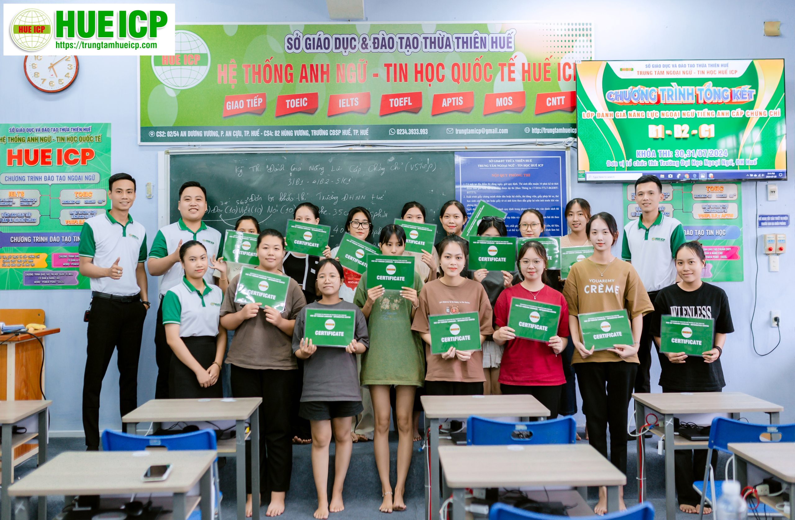Vào tối ngày 30/07/2024 Trung Tâm Huế ICP đã tổ chức tổng kết lớp VSTEP – K07.2024, trong buổi tổng kết đã có cán bộ trung tâm phổ biến về quy chế và hình thức thi để giúp học viên chuẩn bị tốt cho kỳ thi sắp tới, sau đó đã trao chứng nhận hoàn thành khóa học cho các bạn học viên.